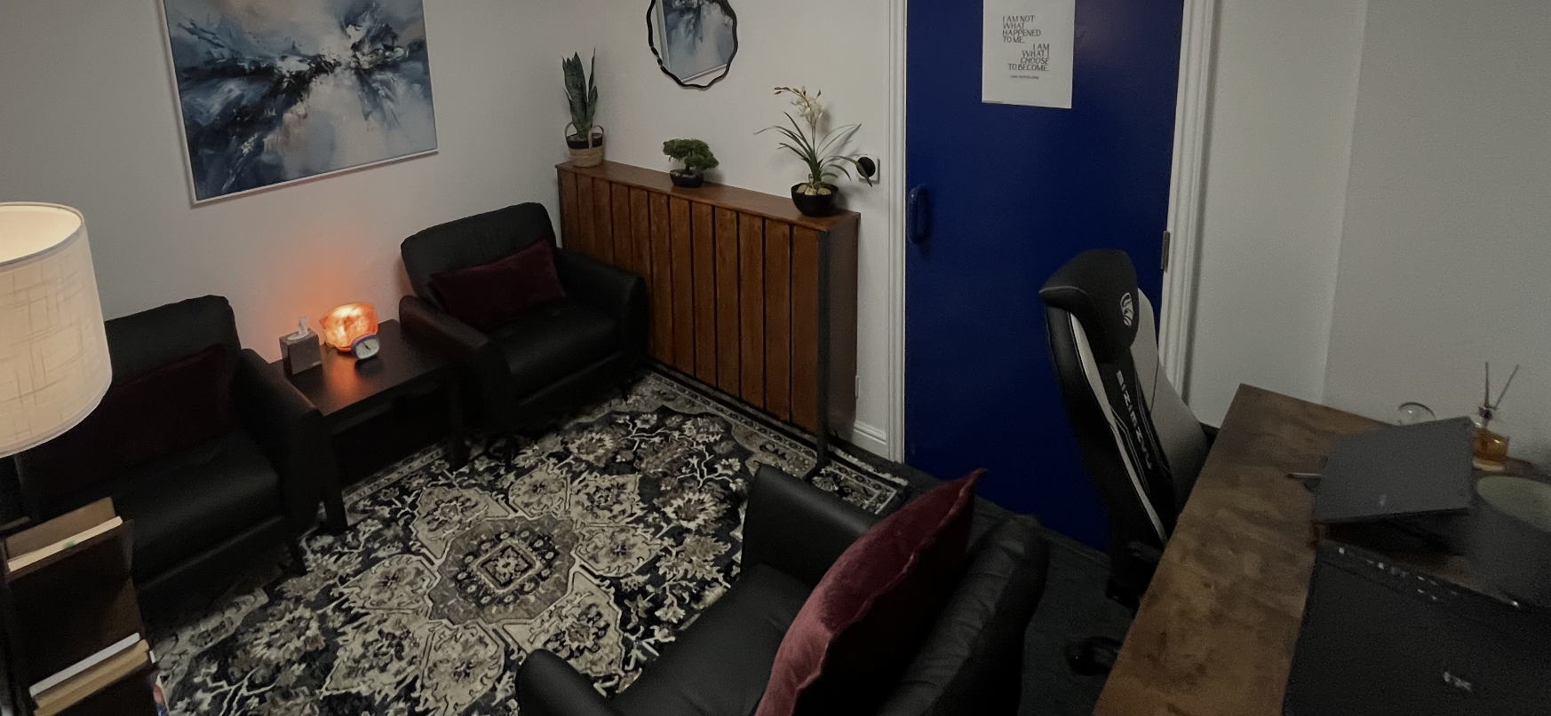 My practice is based in a quiet, discreet location in Bedford, offering privacy from the moment you arrive. The counselling room is warm, comfortable and designed to help you feel safe, grounded and at ease.